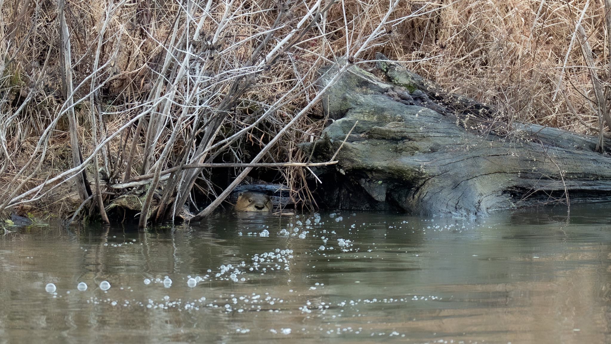An otter peering out from under some brush at Huntley Meadows